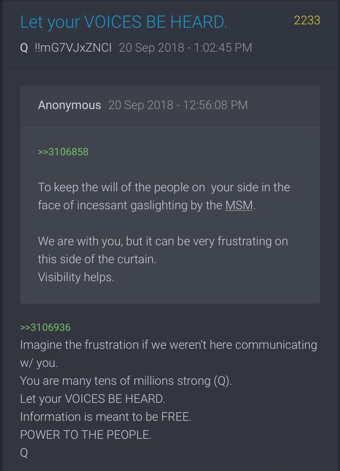 The greatest story ever told about how America has been saved from the dregs of Political Warfare. The people have been given back their voice. Thanks to the “Q” phenomenon. This is our purpose.